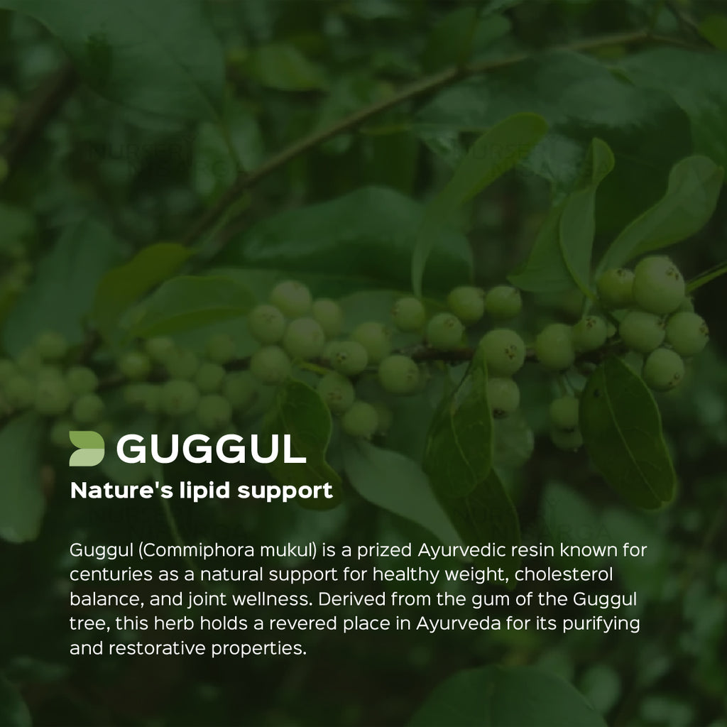 Guggul Extract capsule (Commiphora Mukul) In ayurveda very useful to control and support cholesterol level & Lipid Metabolism. In Ayurveda Gum Guggul is also known by the names Guggul, Indian Bedellium and has Botanical name as Commiphora mukul. Guggul Extract is the sticky oleo gum resin from the Commiphora Mukul tree which plays a major role in the traditional herbal medicine of India. Ayurveda mentions that Guggul Extract is Bitter, astringent in taste, hot in potency and pungent after digestion, helps to improve blood circulation, decreases Vocal cord swelling & improves voice quality. It is digestive, appetiser, removes extra mucous from channels of the body and helps to reduce sugar levels.