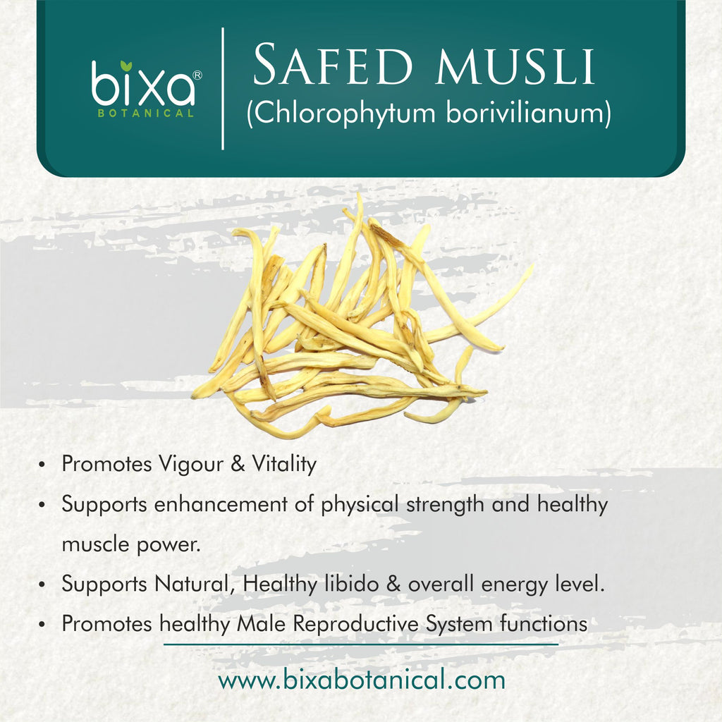 Safed Musali is decorticated rhizome or tuberous root of Chlorophytum borivilianum plant, they are dried and Powder ed....