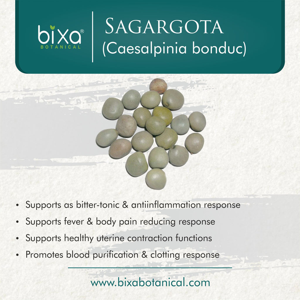 Sagargota [Botanical name : Caesalpinia bonduc] known as Fever nut, is a climbing shrub common throughout India, near the sea-coasts, especially all over Bengal, Bombay & whole of southern india. Bonducella the name of the species is derived from the Arabic word Bonduce meaning a little ball which indicated the globular shape of the seed. The seeds are grey coloured and resemble eyeballs, which explains the Sanskrit name kuberakshi, meaning eyes of kubera, the Hindu God of wealth. Sagargota also called latakaranj, Katkaranj, Fever Nut (English) has been mentioned in all Ayurvedic texts and has been traditionally used as a uterine stimulant, to cleanse the uterus & maintain its proper contraction. Sagargota supports to alleviate fever signs like body pain, helps to reduce edema/swelling in the body, joint inflammations and abdominal pain. Ayurveda mentions Sagargota as pungent, bitter and astringent in taste. Sagargota helps to alleviate aggravated kapha and vata doshas. Sagargota promotes blood purifications and helps to stop internal bleeding. Externally - In abdominal flatulence, the paste of Sagargota seeds mashed in water eases the problem. On testicular swelling due to a hydrocele & trauma, the thick paste of Sagargota seed is applied. Research scientific study of Sagargota extact has shown promising action to lower glucose absorption hence supports low blood sugar. The research study of Bonducella nut obtained has shown presence of Phytosterols, Flavonoids which clearly indicates that Caeselpinia bonducella has a significant potential to use as a natural antioxidant agent and promotes anti-inflammation action.