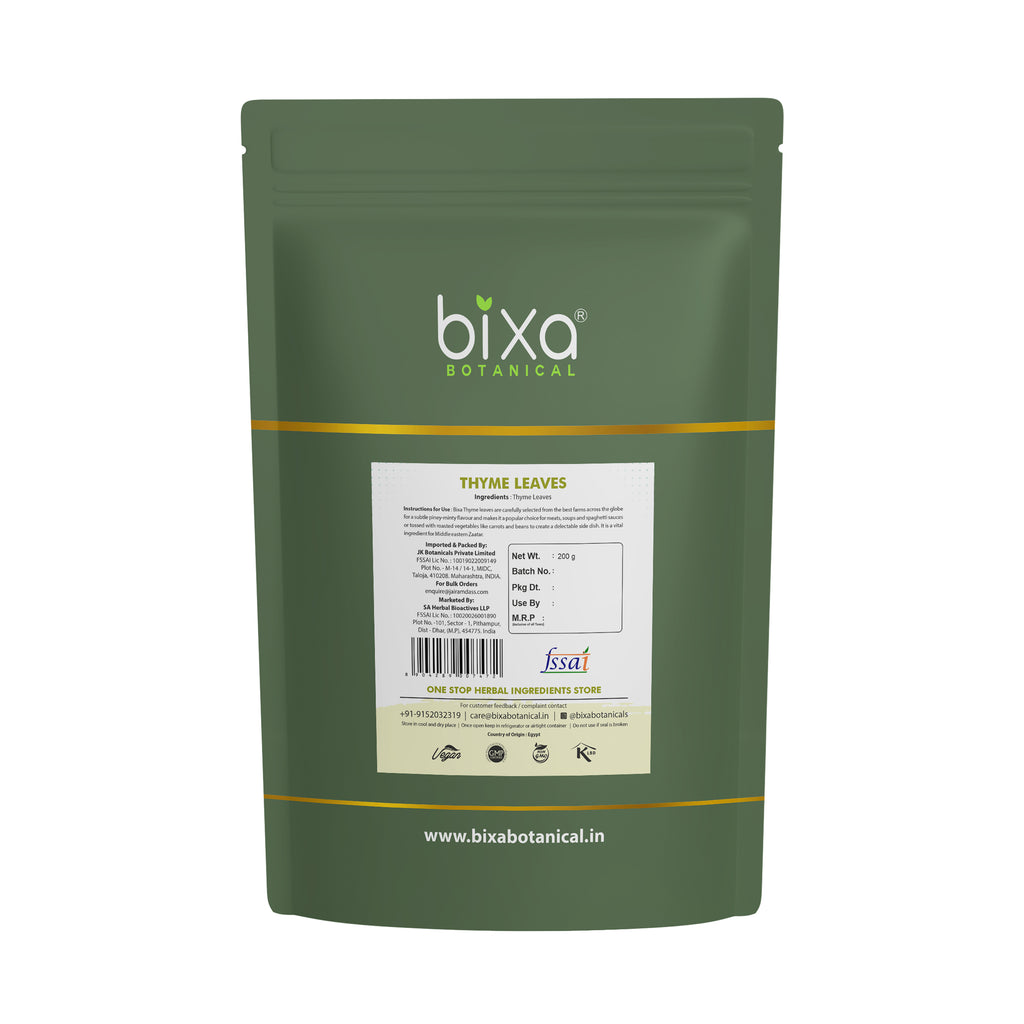 Bixa Thyme leaves are carefully selected from the best farms across the globe for a subtle piney-minty flavour and makes it a popular choice for meats, soups and spaghetti sauces or tossed with roasted vegetables like carrots and beans to create a delectable side dish. It is a vital ingredient for Middle eastern Zaatar.