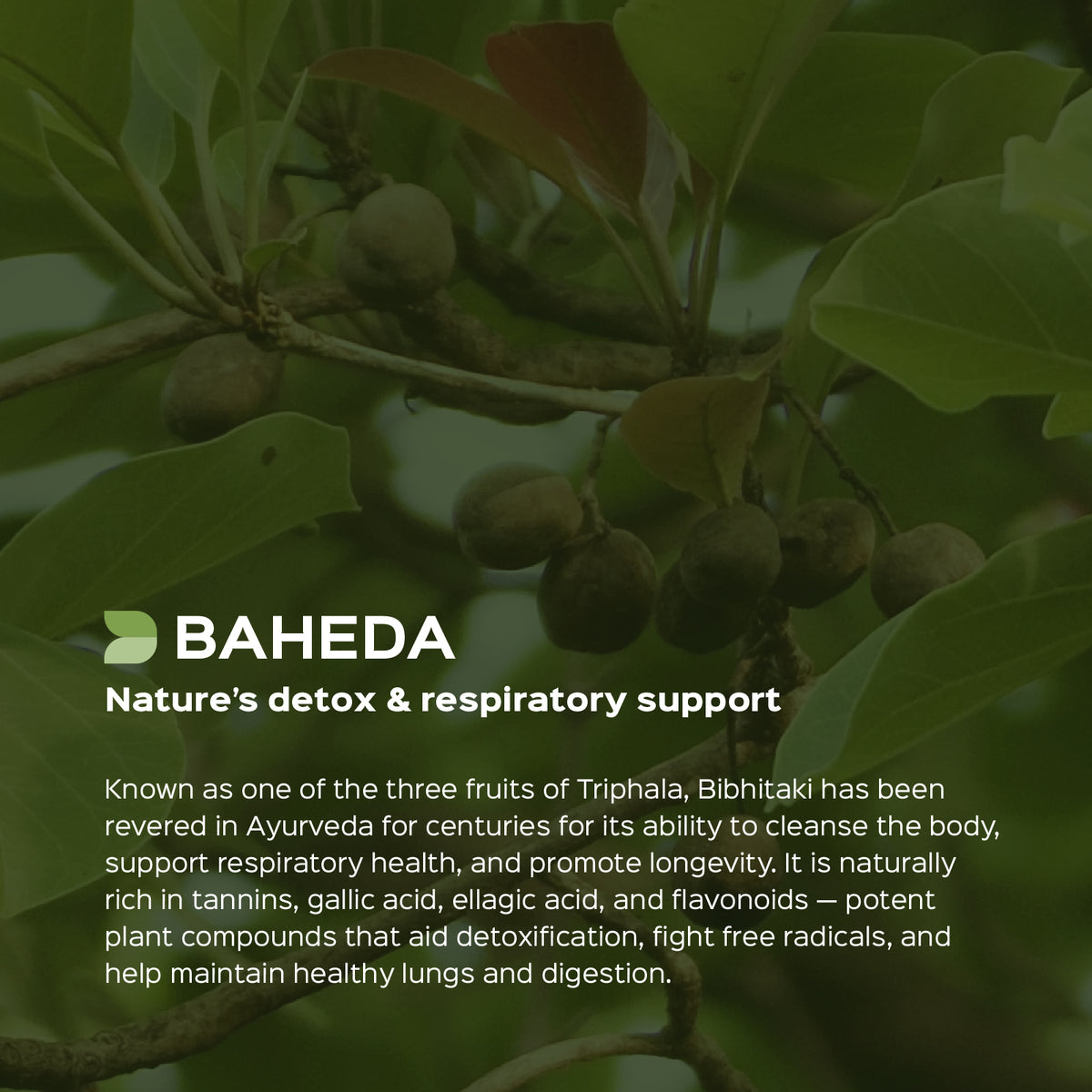 Bibhitaki—also known as Baheda or Vibheetaki in Sanskrit—is one of the powerful three fruits in the classical Ayurvedic formulation Triphala, alongside Amla and Haritaki. Its name literally means “that which removes fear of disease”—a testament to its deeply detoxifying and rejuvenating nature.