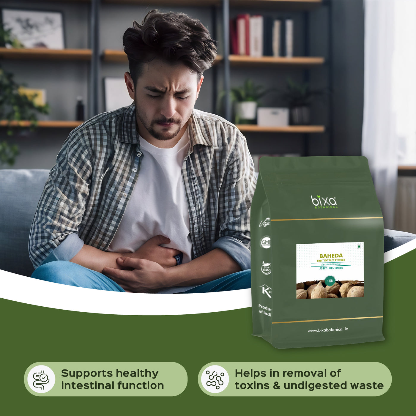 Bibhitaki acts as a mild natural laxative and digestive aid. Its high fiber and astringent properties help relieve constipation, reduce bloating, and support smoother bowel movements.