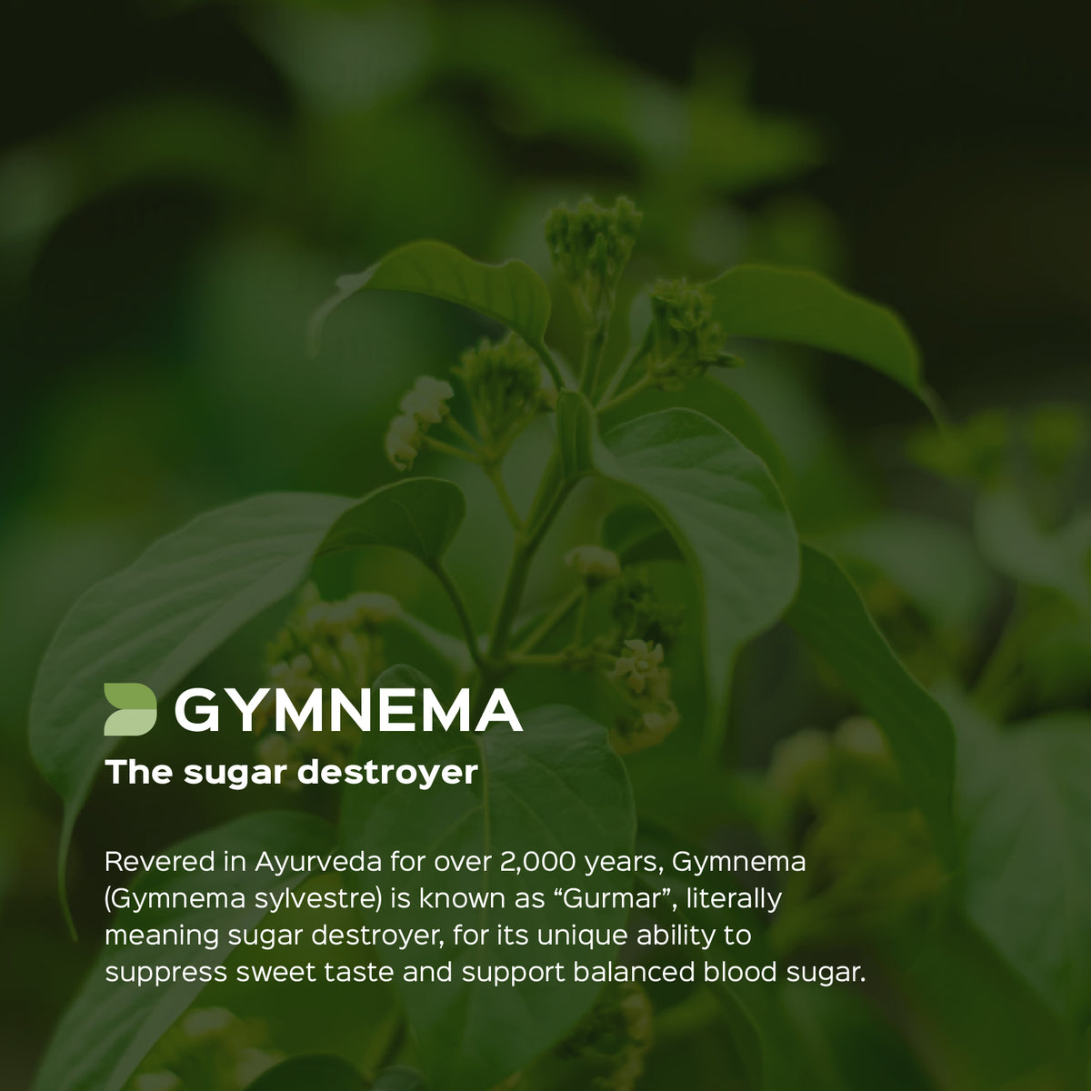 Gymnemic acids in the leaves block the sugar receptors on the tongue, reducing the desire for sweets. Internally, it slows the absorption of sugar from food, supporting better glucose control and appetite balance.