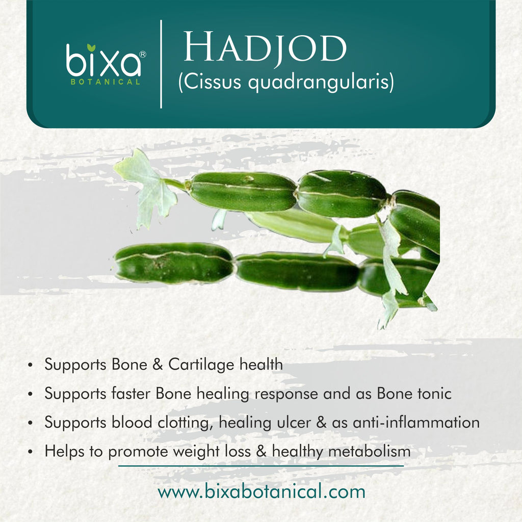 Bixa Hadjod Powder is prepared from roots of Botanical herb Cissus quadrangularis. Cissus quadrangularis is a succulent vine from Africa and Asia continent. Cissus is one of the most commonly used medicinal plants in Thailand, and is also used in traditional African and Ayurvedic medicine. All parts of the plant are used for medicine, especially roots. Cissus quadrangularis is a type of plant that is a part of the grape family. It is sometimes referred to as Veldt Grape, Devil's Backbone, Asthisamharaka in Sanskrit and Hadjod as common name. The Hadjod have proven to be very useful in herbal medicines, and can now be accessed in supplement form in many parts of the world. The active ingredients in Cissus quadrangularis Extract that make it so powerful include a range of carotenoids, triterpenoids, vitamins, 3-keto steroids and minerals. The Hadjod may help to prevent the degradation of bone matter in the body and stimulate bone growth. To be more specific, research has revealed that Cissus quadrangularis stimulates the production of osteoblasts, which are the cells in the body responsible for growing bone. This plant is also commonly suggested as an herbal remedy for people who have recently broken bones as a way to speed the healing process. The Hadjod root is rich in Vitamin C which is a crucial component of Collagen, useful for tissue healing and growth. Cissus quadrangularis is able to relieve cramping and discomfort during menstruation, making it highly desirable in the market of herbal remedy world. Study shows that Cissus quadrangularis taken regularly with a healthy diet and exercise plan can suppress appetite, burn fat & help promote weight loss. Research study has also shown beneficial action on inflamed haemorrhoids and overall improvement of health.