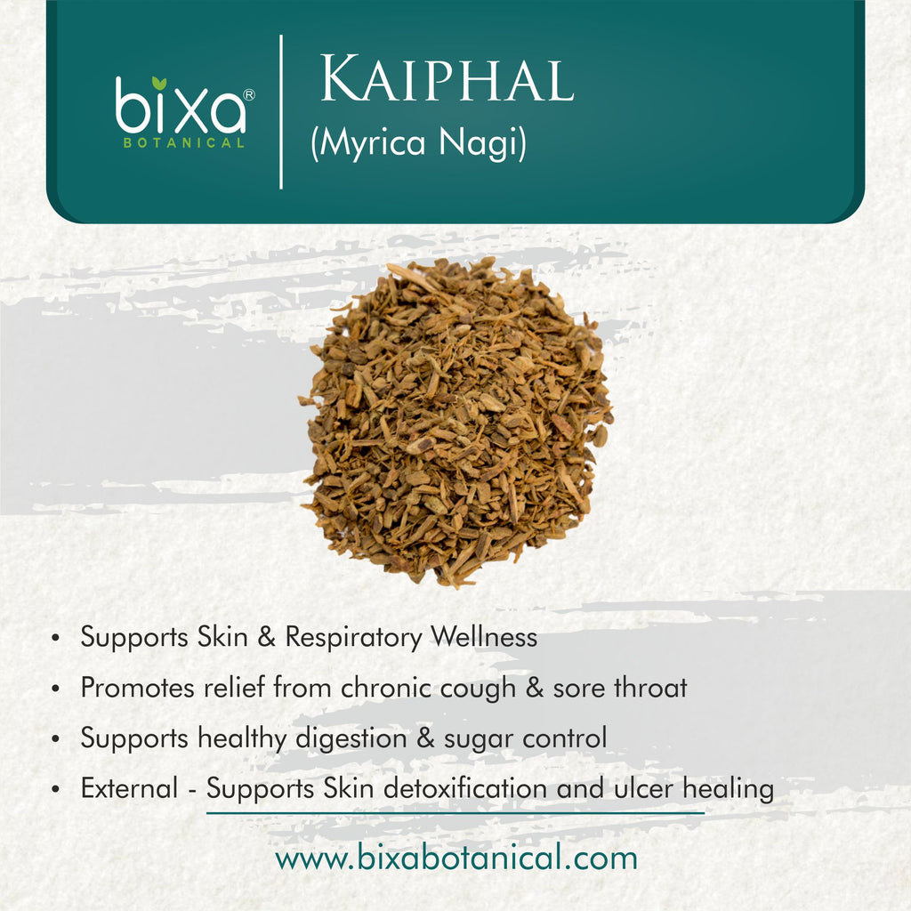 Kaiphal or Katphala [ Botanical name – Myrica esculenta or Myrica Nagi] is globally distributed across Indo-Malesian region. Within India, kaiphal is found in Jammu & Kashmir, Himachal Pradesh, Uttar Pradesh, Sikkim, Arunachal Pradesh, Assam, Meghalaya, Nagaland, Manipur and Mizoram. Kaiphal is also called as Box myrtle or Bayberry. As per Ayurvedic science Kaiphal bark is used as medicinal part and helps to pacify aggravated kapha & Vata. Kaiphal Powder supports health during fever, cough & common cold. Ayurveda mentions kaiphal Powder use with dalchini Powder promotes relief from throat soreness, voice hoarseness, and indigestion & tongue bitterness. Ayurveda also mentions use of Kaiphal Powder , as local application on piles with catechu, asafoetida and camphor in ghee, internally also Kaiphal may help to reduce symptoms of piles. Powder of Bay berry is sprinkled over fresh wound which promotes bleeding control & faster healing. Kaiphal bark water decoction gargling supports relief from swelling of gums and oral ulcers. Bay berry Powder taken with butter milk, helps to control loose motions in diarrhoea & promotes relief from indigestion. Modern & scientific studies suggest that kaiphal extract possesses significant anti-allergic and anti-inflammatory activity and may be useful in combating allergic disorders such as allergic asthma and allergic rhinitis by decreasing bronchial hyper-responsiveness. Recent studies confirmed presence of gallic acids, Flavonoids which supports as antioxidant, controls high blood sugar level, combats excessive bleeding & piles.
