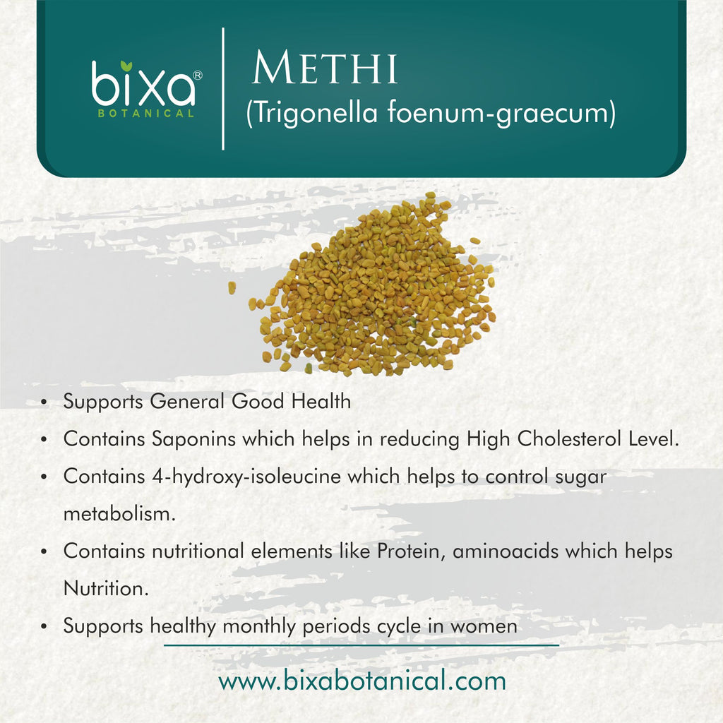 According to studies fenugreek extract supports low cholesterol level naturally, especially that of the low density lipoprotein (LDL). Fenugreek extract are known to be rich source of steroidal saponins that supports prevention of the absorption of cholesterol and triglycerides. Fenugreek extract has shown presence of 4-hydroxyisoleucine, galactomannan, which plays a key role to maintain healthy heart & decelerating the absorption rate of sugar into our bloodstream, thus bringing Average Sugar level down & improving glucose metabolism. Methi also contains high amount of potassium that counters the action of sodium to help control heart rate and blood pressure.
