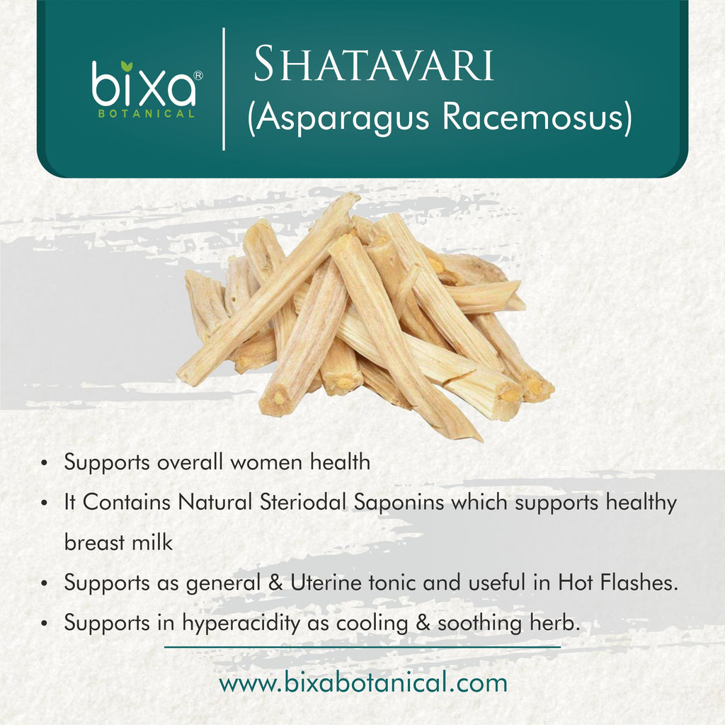 Asparagus Racemosus (Satavar, Shatavari, or Shatamull) is a species of Asparagus commonly found throughout Nepal, Sri Lanka, India and the Himalayas. Shatavari or Asparagus Racemosus is an important plant in traditional medicine in tropical and subtropical India. Its medicinal usage has been reported in the Indian and British Pharmacopoeias and in traditional systems of medicine such as Ayurveda, Unani, and Siddha. As per Ayurveda Asparagus is sweet-bitter, cold in potency & mitigates Vata, Pitta & Rakta (Blood) disorders. It promotes intelligence, eyes health & helps to improve milk duct flow (galactagogue) in post-delivery women & is a nutritive rejuvenator. Shatavari also helps to build Ojas, the precious fluid in the body that governs vitality, virility, immunity, and sleep. Hence, it is also called "Queen of Herbs"! As per Ayurveda, Shatavari or Asparagus is indeed a primary uterine tonic for weak & malnourished women. It supports well being & general health of Uterus in all ages, especially during menopause, protecting it from numerous ailments & mood swings. Asparagus benefits male reproductive system, too. Its mucous enhancing properties help to increase the reproductive fluids, supporting a healthy sperm count and genital organs in men. As per modern study - Shatavari or Asparagus, primarily help as a reproductive tonic (both male and female), promotes soothing effect on the digestive system and as a powerful adaptogen (which helps the body to adapt to various unhealthy surroundings). As a reproductive tonic, Shatavari helps to regulate the menstrual cycle and female hormones, reduce vaginal pain during the monthly cycle. Shatavari promotes uterine strength during pregnancy, childbirth and ample lactation (flow and quantity of milk). Shatavari helps to reduce hot flashes, night sweats, irritability, hormonal disturbances and dryness during menopause.
