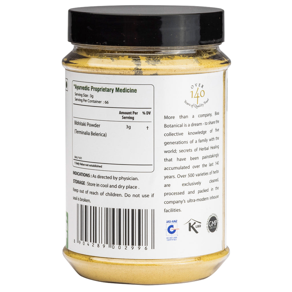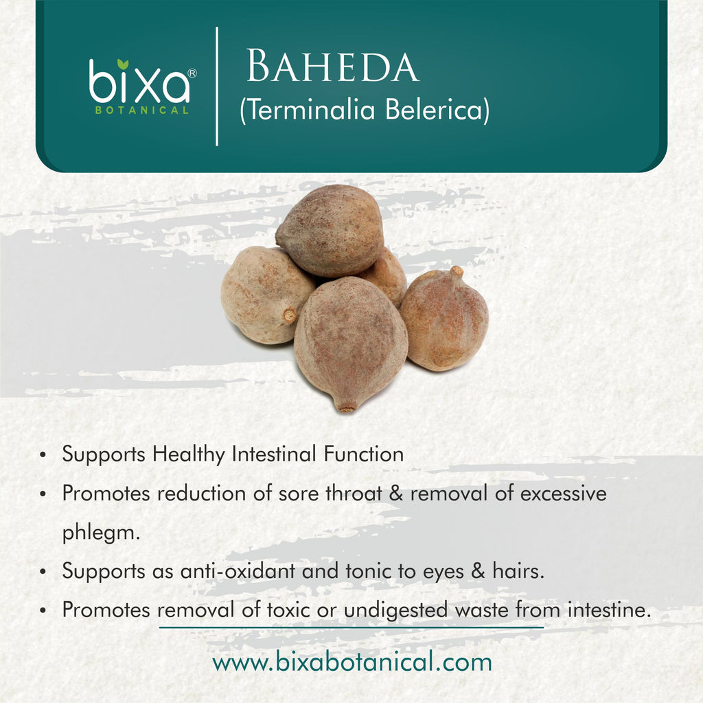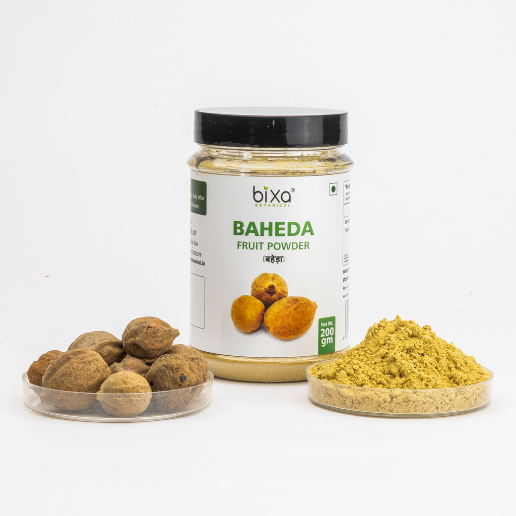 In Sanskrit, Bibhitak is known as “Vibheetaki” in which ‘bheeta’ means fear and ‘Vibheeta’ means lack of fear. The whole word “Vibheetaki” means the fruit that takes away the fear of disease. Bibhitak or Baheda is one of an important herb in three myrobalans (fruits, Triphalla – 3 fruits), i.e. Amla, Harde and Baheda having Latin Name – Terminalia Bellirica. As per Ayurveda Bibhitak is hot in potency and helps to reduce Vitiated Pitta & kapha dosha’s (Humors) of the body. Bibhitak is a natural laxative and contains dietary fibres which are digestive agents & fights with constipation related problems. This also helps to eliminate problem of piles and anal pain. Bibhitak Powder when taken with Harde and Amla (triphalla) Powder in equal amount helps to remove toxicity from body and rejuvenate each organ. Ayurveda mentions use of Bibhitak Powder with honey early morning to sooth sore throat, reduce throat inflammation, cough & cold and increase immunity. Bibhitak Powder when taken daily at night time with warm water or buttermilk helps to reduce spleen swelling. The tannins and other ingredients in Bibhitak have good positive effect on brain activity increasing its working capacity.