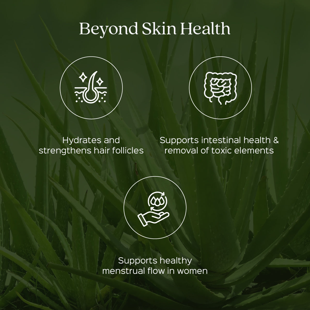 Rich in antioxidants and hydrating enzymes, Aloe Vera supports natural skin detox, soothes inflammation, and promotes clear, glowing skin. Its internal use may also support collagen production and skin resilience.