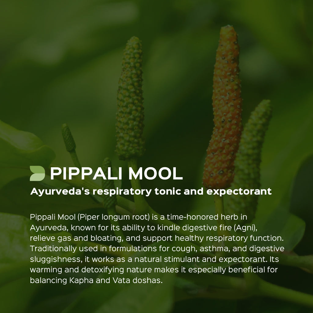 Pippali, Pimpali or Piper Longum (Latin, linn) is an indigenous plant to North- eastern & southern india and Ceylon, cultivated in Eastern Bengal. Pippali is the term applied to the fruit of piper longum and pippali mool to roots of piper longum plant. Pippali Mool has milder effects than Pippali & is available in small cylindrical pieces of nodal and internodal pieces, about 2 mm thick. Ayurveda mentions uses of pippali roots as anti-inflammatory, pain killing, for reducing abdominal gases, as laxative, and expectorant. As per Ayurvedic principle Pippali mool is hot in potency, and used to handle diseases that occur due to vitiation of Vata (air), and Kapha (phlegm) Dosha/humour. In Ayurvedic text it is mentioned that due to hot potency the roots are used in digestive weakness, and promoting respiratory functions. Pippali roots helps to relieve inflammations, edema, and restores the structures of the body to normalcy, improves appetite, and relieves flatulence. Pippali mool supports proper bile function & stimulates it to maintain healthy Liver functions.