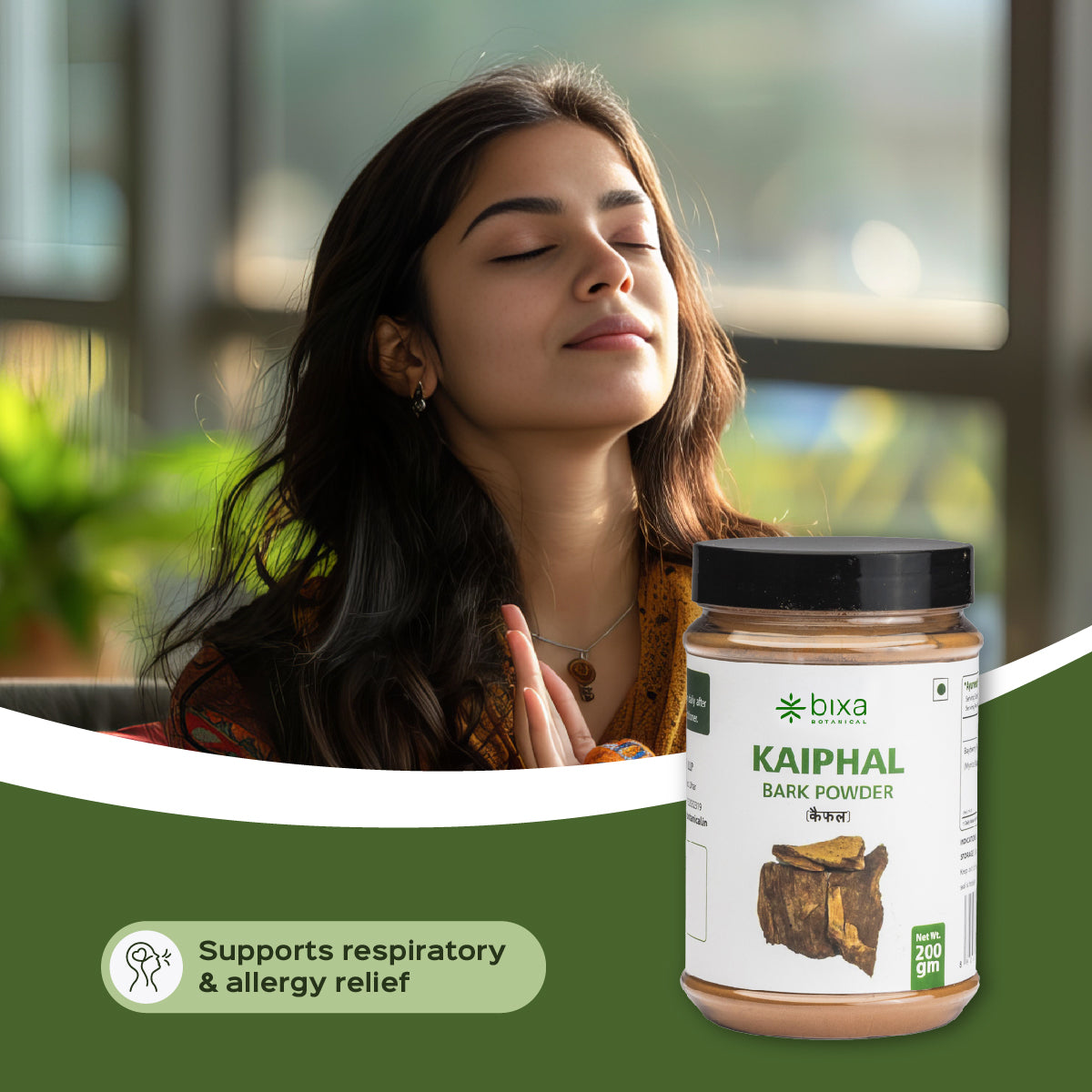 Traditionally, Kaiphal bark is used to relieve cough, cold, sore throat, indigestion, oral ulcers, and piles, while also supporting wound healing and skin detoxification. Modern studies validate its ancient reputation, highlighting its anti-inflammatory, anti-allergic, antioxidant, and blood sugar–regulating properties, thanks to active compounds like gallic acid and flavonoids.