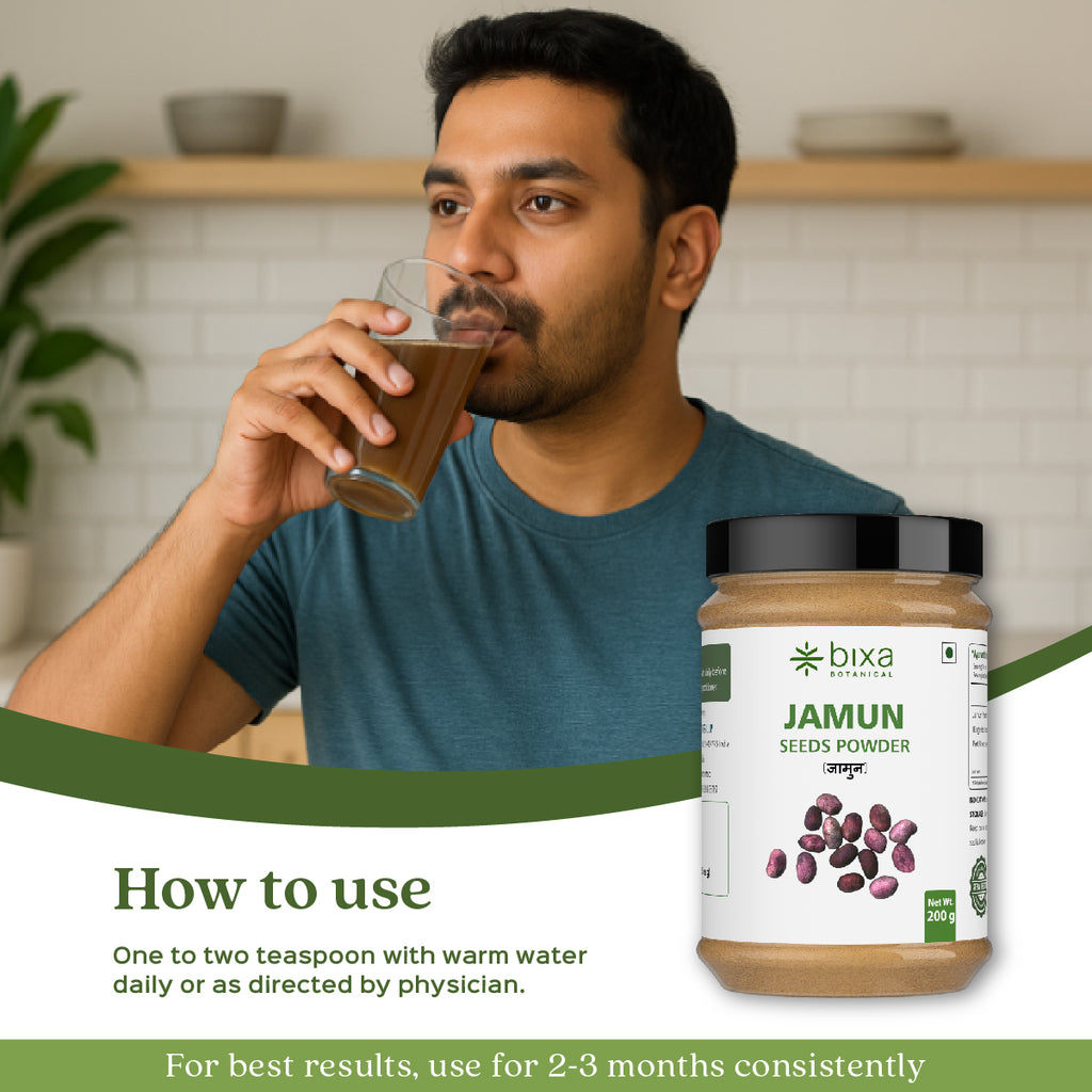 Jamun (Botanical – Eugenia jambolana), also popularly known as jambul, jambolan, java plum is a nutritious seasonal fruit found in abundance in Asia. Jamun fruit is eaten as a health snack in many parts of the world. Jamun is a delicious tropical plum-like fruit rich in vitamins and minerals. Fruit, seeds, bark and leaves of Jambul have medicinal properties. Jamun is loaded with antioxidants and Flavonoids essential for a healthy body and mind. As compared with other fruits, Jambul provides lesser calories making it the perfect choice in a healthy diet! Jamun helps as Astringent in action and has alleviated Kapha/pitta reducing property. Jamun is widely distributed throughout India and ayurvedic medicine (Indian folk medicine) mentions its use for the treatment of diabetes mellitus. As per Ayurveda Jamun Seed Powder supports healthy digestive functions, is an excellent home remedy for stomach bloatingness & irritation in the intestinal layers. Jamun or Java plum is also administered with mango seed Powder to support in case of diarrhoea & dysentery. Powder of seeds in jamun juice is excellent for individuals with a suppressed immune system and as anti-oxidant. The Glucoside Jamboline present in Jamun is said to have power of checking the pathological conversion of starch in to sugar in cases of increased production of glucose, thus regulating sugar metabolism. Jamun also promotes lowering of quantity of sugar in urine & allays the unquenchable thirst in diabetes.